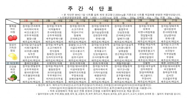 봄의 시작을 알리는 우수 절기에 어르신 건강을 위하여 오미산적,사골오색떡국,냉이된장국,동태전,도토리묵무침,버섯소불고기,녹두전,도라지오이무침,봄동나물,무톳밥,유채나물,김치전,섬초시금치,에그샐러드,야채계란말이,수제약식,유과,수제식혜,단팥죽 등 어르신 면역력 향상을 위한 설 명절 음식으로 준비하였습니다.신선한 제철 식재료로 어르신 건강을 위하여 정성을 다하여 조리 하겠습니다.