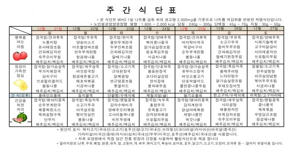 일년 중 밤이 가장 길고 낮이 가장 짧은 동지 절기에 어르신 건강을 위하여 한우설렁탕,들깨추어탕,버섯청국장,느타리탕수,세발나물전,버섯소불고기,톳샐러드,버섯청국장,서리태콩자반,코다리강정,팥죽,수제식혜,어묵탕 등 어르신 면역력 향상을 위한 절기 음식으로 준비하였습니다.신선한 제철 식재료로 어르신의 건강을 위하여 정성을 다하여 조리하겠습니다.