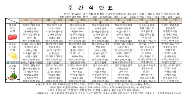 맑고 포근한 봄 날씨에 어르신의 건강을 위하여 콩가루쑥국,게살스프,버섯소불고기,연어구이,순살치킨가스,맛살스크램블,시래기된장국,백세카레소스,설렁탕,에그샐러드,해물스파게티,제철과일(딸기),고구마라떼,유자차 등 어르신 면역력 향상을 위한 절기 음식으로 준비하였습니다.신선한 제철 식재료로 어르신의 건강을 위하여 정성을 다하여 조리하겠습니다.