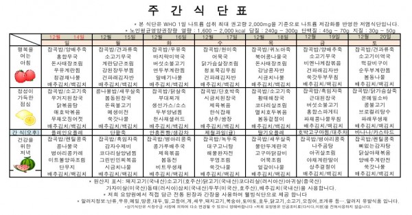눈과 비 소식이 있는 차가운 겨울 날씨에 어르신의 건강을 위하여 나주곰탕,온메밀소바,콩나물밥,뼈없는감자탕,메생이전,버섯소불고기,홍합스파게티,양배추계란전,그린빈민찌볶음,멸치호두조림,브로컬리탕수,단팥죽,안흥찐빵,호박고구마찜,제철과일(귤),생강차,대추차 등 어르신 면역력 향상을 위한 절기 음식으로 준비 하였습니다.신선한 제철 식재료로 정성을 다하여 조리하겠습니다.