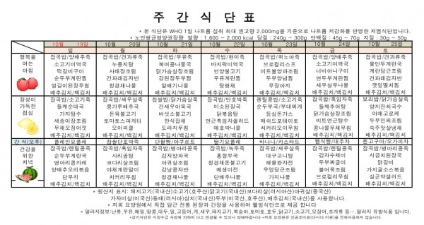 서리가 내리기 시작하는 상강 절기에 어르신의 건강을 위하여 들깨추어탕,사리곰탕,버섯소불고기,들깨순대국,언양불고기,야채계란말이,매쉬드포테이토,비트연근탕수,토마토스파게티,가지탕수,메생이전,찹쌀단호박죽,대추차 등 어르신 면역력 향상을 위한 절기 음식으로 준비하였습니다.신선한 제철 식재료로 어르신의 건강을 위하여 정성을 다하여 조리하겠습니다.