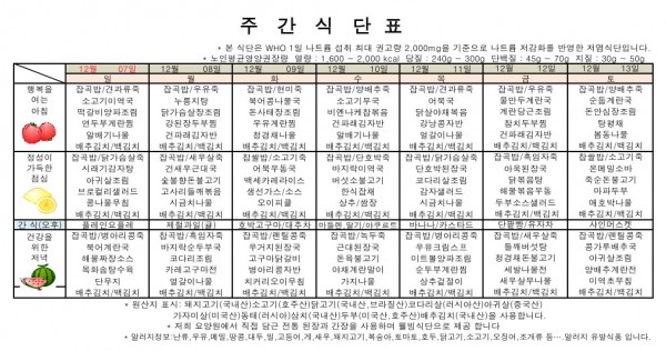 눈이 많이 내린다는 대설 절기에 어르신의 건강을 위하여 시래기감자탕,카레고구마전,버섯소불고기,백세카레라이스,해물볶음우동,들깨버섯탕,두부소스샐러드,단호박된장국,호박고구마찜,제철과일(딸기),마들렌,유자차 등 어르신 면역력 향상을 위한 절기 음식으로 준비 하였습니다.신선한 제철 식재료로 어르신의 건강을 위하여 정성을 다하여 조리 하겠습니다.