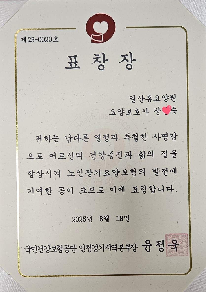 확고한 직업정신과 투철한 사명감을 가지고 입소해 계신 어르신에게 맞춤 돌봄 서비스를 제공한 공로를 인정받아 국민건강보험공단 인천 경기지역 본부장으로 부터 표창장을 수여하게 되었습니다. 귀한 상을 받게 되어 저희 일산휴요양원의 경사가 아닐 수 없습니다. 저희 일산휴요양원 직원 모두에게 주는 상이라고 생각하며 앞으로도 어르신 돌봄에 최선을 다하는 요양원이 되도록 하겠습니다. 감사합니다.
