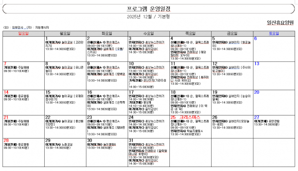 2025년 12월 프로그램 일정표 페이지 정보 작성자 관리자 댓글 0건 조회Hit 51회 작성일Date 25-12-02 10:59 본문 상기일정은 요양원 일정에 따라 달라질 수 있습니다. 위 표를 클릭하시면 큰 화면으로 보실 수 있습니다. 목록 다음글2025년 11월 프로그램 일정표 25.11.02 댓글목록 댓글목록 등록된 댓글이 없습니다.