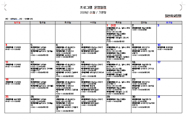 2026년1월 프로그램 일정표 페이지 정보 작성자 관리자 댓글 0건 조회Hit 86회 작성일Date 26-01-20 20:47 본문 상기일정은 요양원 일정에 따라 달라질 수 있습니다. 목록 이전글2026년 2월 프로그램 일정표 26.02.01 다음글2025년 12월 프로그램 일정표 25.12.02 댓글목록 댓글목록 등록된 댓글이 없습니다.