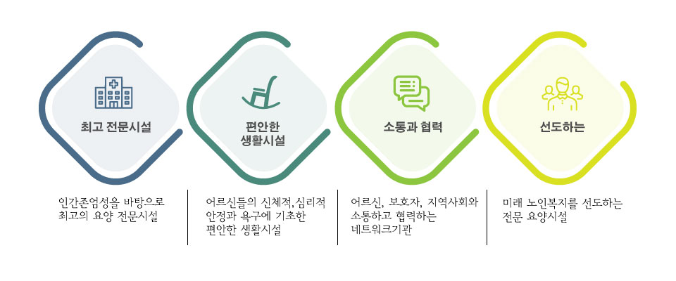 또한 풍부한 영양, 입맛에 맞는 웰빙식사 제공은 물론 다채로운 프로그램 및 간호, 재활서비스로 정서적 안정과 만족을 드릴 수 있도록 항상 노력하겠습니다.